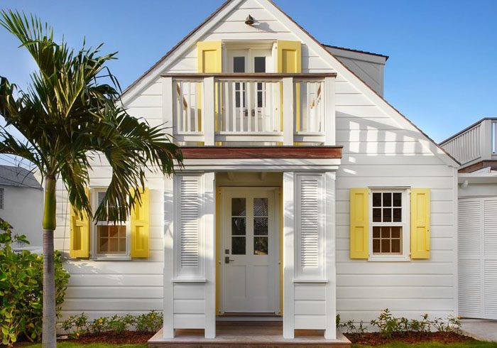 Начинать лучше всего с экстерьера, вернее про него не нужно забывать. Лучше всего выбрать светлую цветовую гамму. На деталях нужно сделать яркий цветовой акцент, привлекая к ним внимание, это могут быть двери или ставни. Солнечный желтый, синий, бирюзовый будут смотреться свежо и красиво.