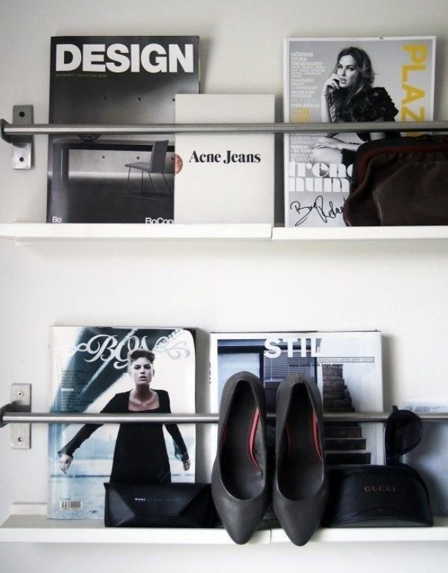 Кухонные рейлинги пригодятся в гостиной — для красивого хранения книг и журналов. Зачем рассказывать гостям о литературных вкусах, когда можно продемонстрировать их?