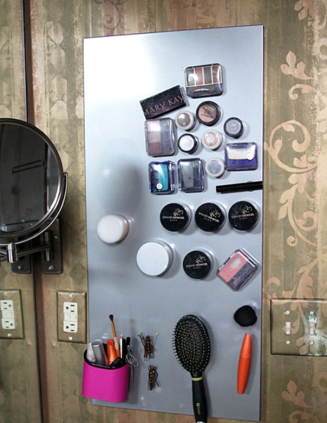 Приклеив магниты на упаковки косметических продуктов, вы сможете хранить их вертикально — на красивой металлической доске. Это сэкономит место и придаст интерьеру изюминки.
