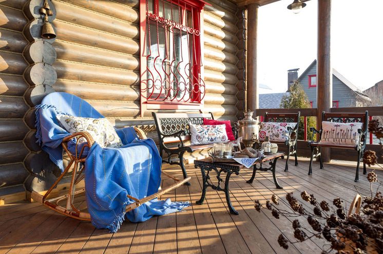 Бревенчатый дом поставили на монолитном железобетонном фундаменте, кровлю оформили металлической черепицей, а цоколь облицевали фасадным камнем. Перила, входную дверь и оконные рамы выкрасили в ярко-красный цвет: эту идею хозяева когда-то подсмотрели в одном из интерьерных журналов и твердо решили, что их будущий дом будет выглядеть именно так.