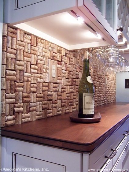 Фартук-«энотека» Еще один необычный материал для кухонного фартука — винные пробки. Понадобится плита ДСП (на которую и будут крепиться пробки), резак, клей и большое количество пробок. Ориентир — порядка 1000 штук на фартук длиной 2 метра.