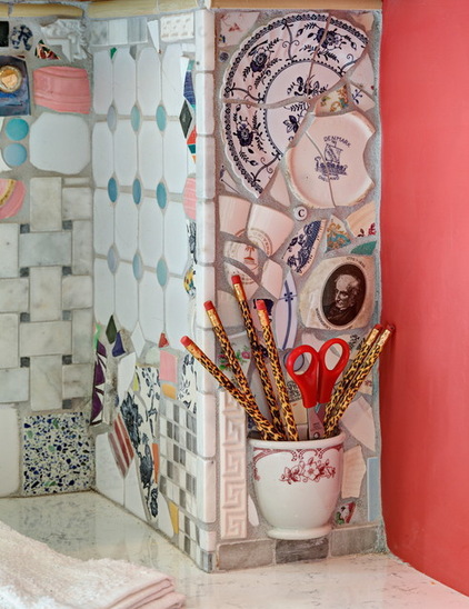 Совет: Добавьте в композицию остатки плитки. Или киньте клич среди друзей-родственников и соберите всю ненужную посуду «на бой». В интерьере с фото для успешной реализации «разбитного» проекта бабушка хозяйки дома даже пожертвовала несколько целых предметов сервиза.