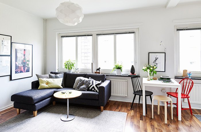 Интерьер маленькой квартиры отличается скандинавской скромностью и простотой. Здесь использованы простые и чёткие формы, прямые линии. Декора не много, и он является непосредственным инструментом, который помогает бороться за визуальное расширение пространства.