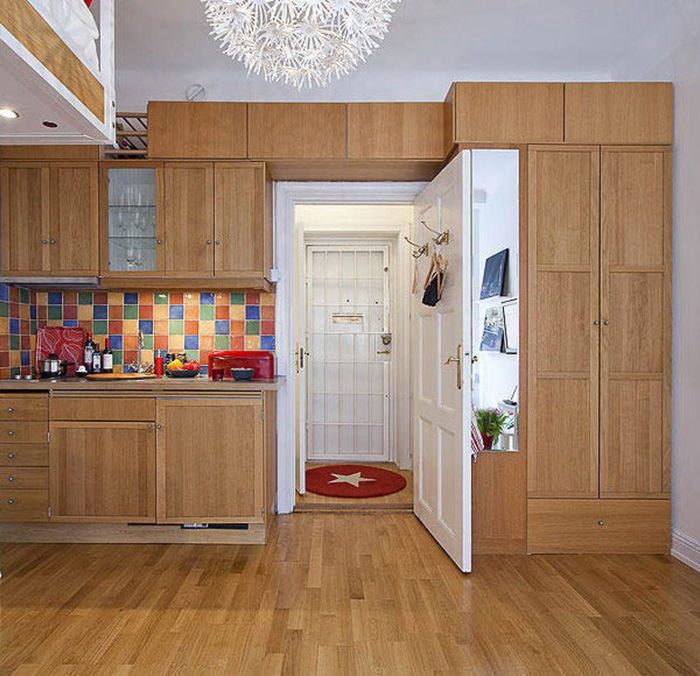 Куда же в малогабаритке спрятать все вещи? В первую очередь можно купить диван с местом для хранения вещей. Также в маленькой квартире будет уместен высокий шкаф с большим количеством внутренних отсеков и выдвижных ящиков. Место над дверью и под потолком тоже не нужно игнорировать, здесь поместится немало вещей.