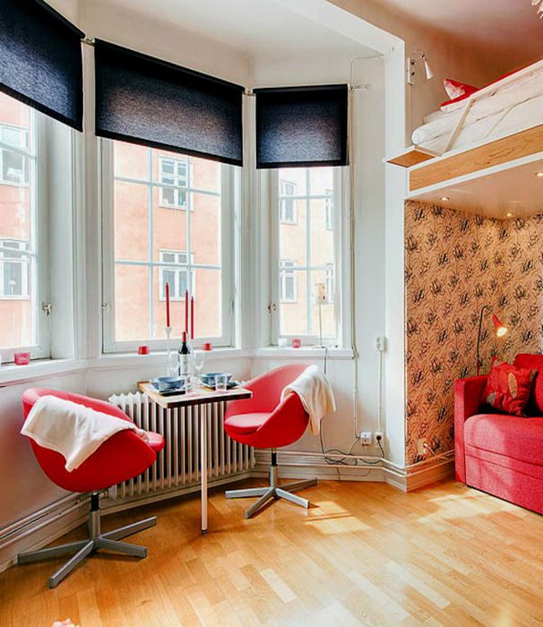 Хозяевам этой небольшой квартиры здорово повезло с наличием трёх, пускай и не очень широких, окон. Они буквально заливают помещение естественным светом, что визуально влияет на увеличение площади. Вместо традиционных штор в маленькой комнате лучше вешать римские шторы или жалюзи, как сделали в этом интерьере. Цвет штор здесь довольно неожиданный, но вполне практичный.