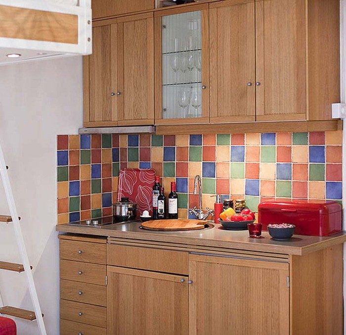 В маленьких квартирах желательно уходить от чрезмерного декора. Минимализм является одним из лучших друзей малогабариток. В этой квартире вместо декора сделали акцентную стенку в зоне гостиной и выложили кухонный фартук милой разноцветной мозаикой. На свободной стене расположили несколько дорогих сердцу вещей – фото и гитару.