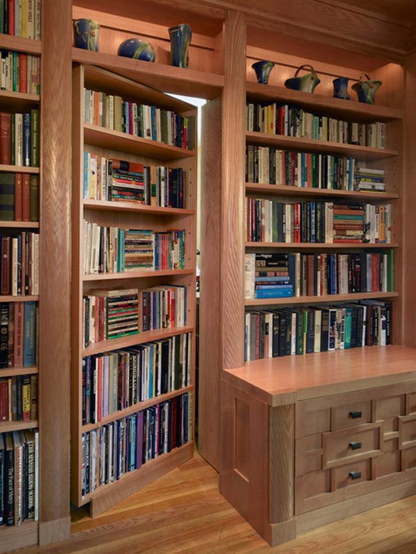 Массивная книжная полка образует великолепный дверной проем для секретной комнаты. В этом случае опорой служат мощные балки, создающие надежную несущую конструкцию