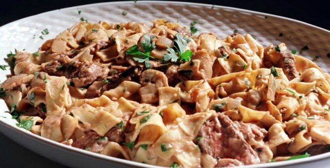 В той же сковороде растопить оставшееся сливочное масло. Обжарить фарш, пока не подрумянится. Добавить муку, перемешать. Добавить говяжий бульон и варить, пока все немного не загустеет. Добавить грибы с луком, затем, помешивая, сметану. Приправить по вкусу солью и перцем. Продолжать готовить, пока все не прогреется, но не доводить до кипения. На тарелку выложить лапшу, сверху мясной соус с грибами.