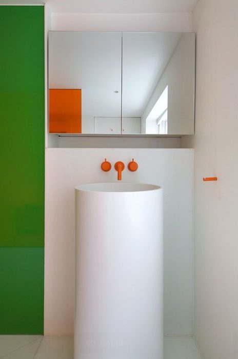 Существует так много цветов, что трудно остановить свой выбор на одном или двух. Почему бы не использовать сочетание многих, например, декорировав фрагмент стены или пол разноцветной плиткой, как в этой ванной комнате. Как альтернатива, можно использовать её по границе стыка пола и стены, выложив в центре плитку нейтрального цвета, в данном случае, белого.