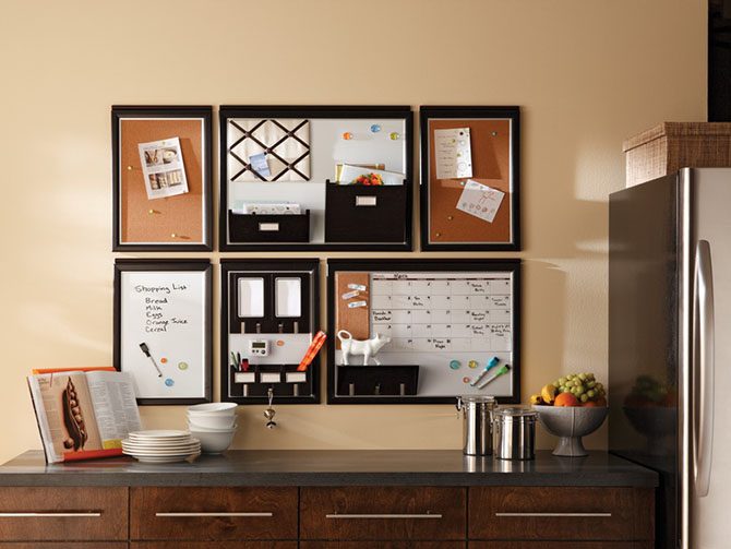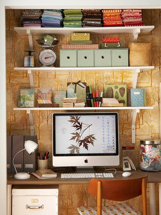 У нас у всех есть множество домашних мелочей, которыми мы часто пользуемся и которые зачастую лежат где ни попадя. Поиск какой-то мелочи или счёта за электричество порой занимает гораздо больше времени, чем выполнение дела, для которого вы эту мелочь ищете. Чтобы избавиться от проблемы и сэкономить время, лучше собрать все эти нужности в одном месте. Например в кабинете, гостиной или кухне. Спальню лучше не использовать для этих целей. Есть несколько замечательных вариантов со стеллажами, пресс-полочками, подвесными мини-офисами и интерьерными органайзерами. Выбирайте любой.