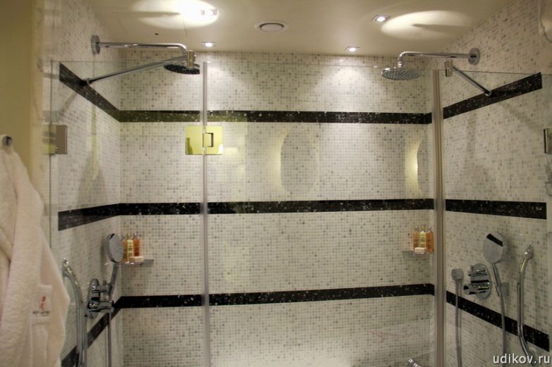 Стационарная скамеечка в душе – тоже довольно частое явление в США. Чтобы легче и проще проводить все манипуляции с телом. Для больших любителей ванных комнат можно там и читать, и о жизни думать, и фильм посмотреть, если вмонтируете специальный экран в душевую панель.