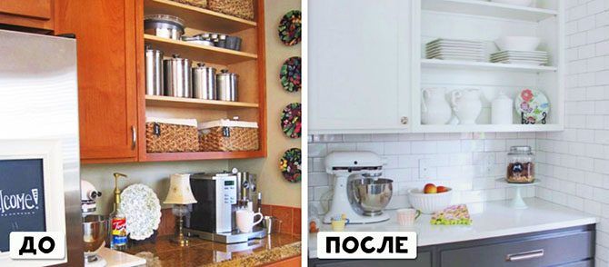 Если вы хотите, чтобы ваша кухня выглядела ярко и привлекательно, необязательно просто забивать все полки различными статуэтками, корзинками, яркой посудой и так далее. Часто для того, чтобы помещение выглядело стильно, нужно наоборот что-то убрать. Задумайтесь, нужно ли все это на вашей кухне? Определитесь со стилем и цветовой гаммой, найдите правильное применение открытым полкам, все лишнее, не задумываясь, убирайте.