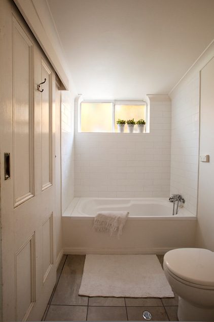 Бывает, что сдвижную дверь не удается расположить вдоль стены коридора — место оказывается занято полками и шкафами. Не беда, дверь может сдвигаться и по внутренней стене ванной комнаты — главное, чтобы хватило места.