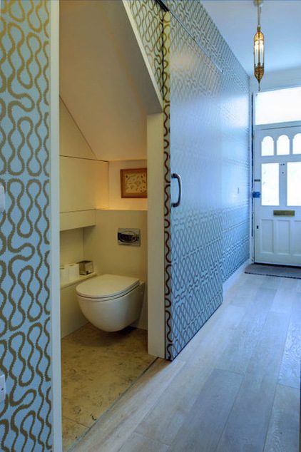Щитовая (плоская) дверь оклеивается обоями со стороны прихожей, а внутренняя поверхность — в тон отделке ванной. Это хороший способ отвлечь внимание от двери в санузел, расположенной в узком коротком проходе.