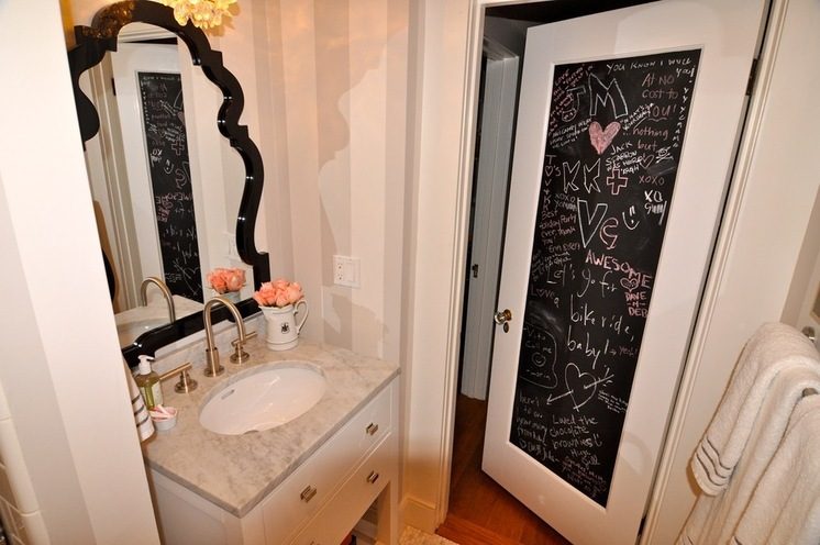Как правило, при очередном ремонте эти двери безжалостно выносят на свалку. Как вариант — их можно оформить меловой краской и разрисовывать на любой манер. Благо вода и раковина, чтобы смыть художества, у вас всегда под рукой.
