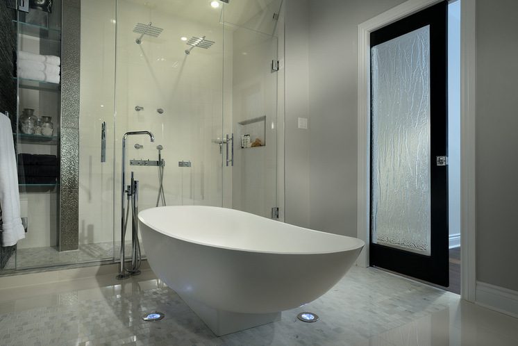 Для установки такой свдижной двери придется существенно увеличить ширину проема, зато ванная комната приобретет роскошный, торжественный вид.