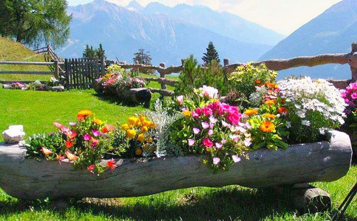 Невероятно оригинальный контейнер может получиться из ствола. Правда, нужно помнить, что далеко не каждое дерево подойдёт для этого. Как только на глаза попалось подходящее бревно, нужно обязательно будет заняться его обработкой. Можно либо сделать выемку в середине, либо использовать для растений уже существующие в нём углубления.