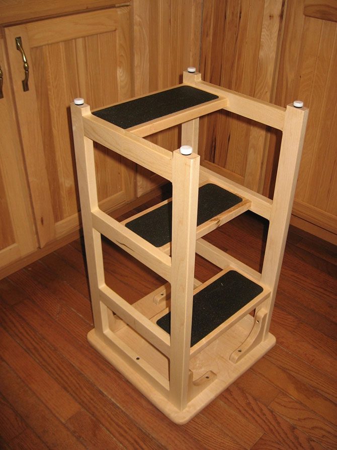 Высокий барный стул можно использовать в качестве стремянки: просто перевернув и добавив ступеньки.