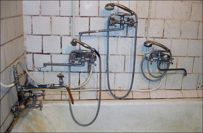 Зачем в одной ванной 4 смесителя? На четырех жильцов одна ванная комната. Холодная вода общая, а вот горячая у каждого своя. У кого проточный водонагреватель, у кого бойлер. У каждого свой вентиль. Помылся — закрыл воду. Не дари соседу халяву!