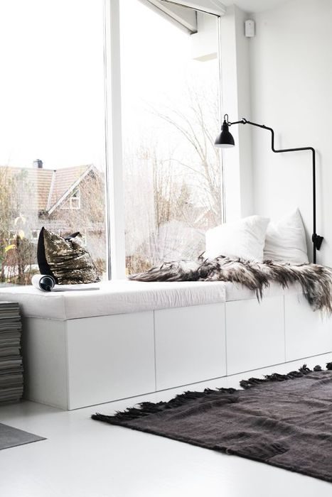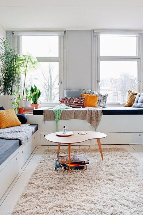 Широкий крепкий подоконник имеет все шансы стать комфортной зоной отдыха. Саму столешницу при этом неплохо оснастить мягкой напольной подушкой и окружить её декоративными собратьями. В холодное время года не лишними здесь будут плед или пушистая шкура.