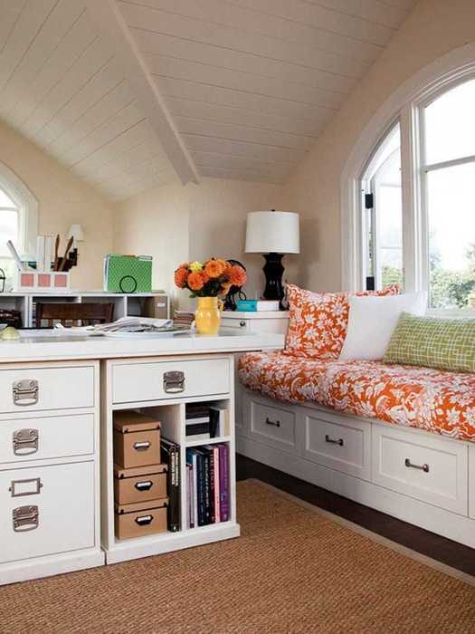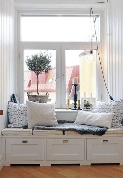 Хранить под подоконником можно не только книги. Здесь прекрасно разместятся небольшие выдвижные ящики, которые также можно сделать своими руками или заказать в столярной мастерской. В них удобно прятать сезонные вещи, обувь, аптечку, инструменты – всё то, что нужно убрать с глаз долой.
