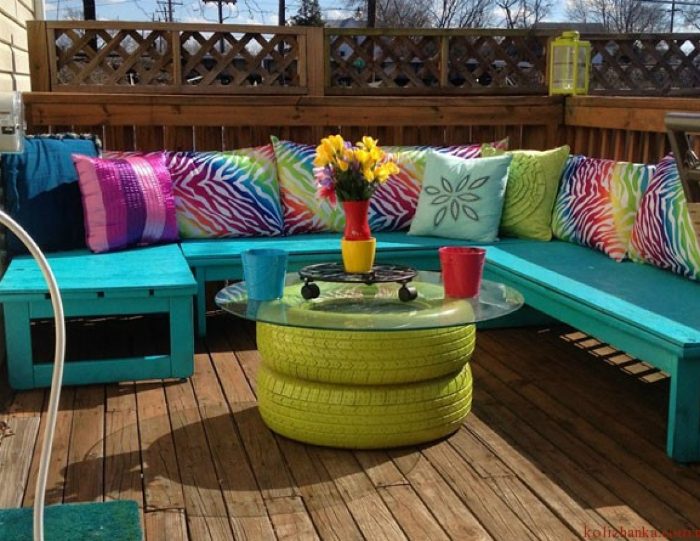 Столик из старых шин, покрашенных в яркий цвет и круглого стекла.