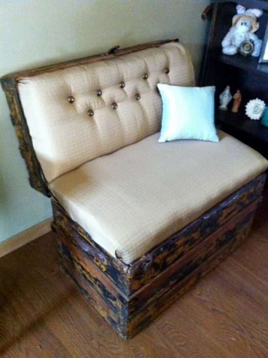 Если оснастить сундук мягкой сидушкой, а его крышку обить мягкой тканью, то он превратится в комфортабельный диванчик. Он без проблем впишется в интерьер кухни, прихожей или гостиной в деревенском стиле. В классических пространствах такой вариант лучше избегать.