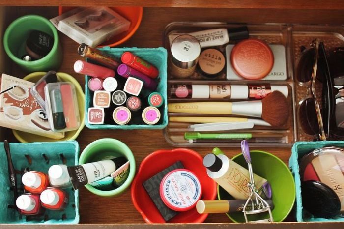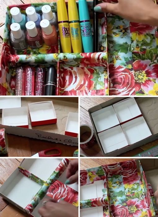 Иногда после шоппинга остаётся немало картонных коробок разных размеров и форм. Из них можно сделать довольно вместительные органайзеры. При помощи клея и картонной бумаги в них желательно сделать ячейки. Так удобнее хранить косметику и каждое средство находится на своём месте. Внешне цвет коробочки можно изменить при помощи декоративного скотча, цветной бумаги и даже остатков обоев.