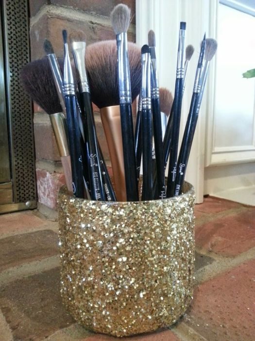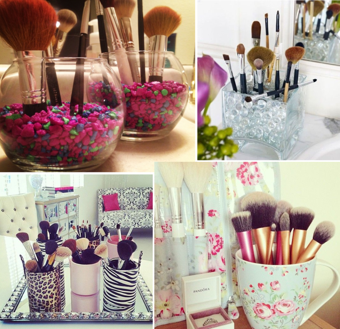 Одно из самых важных мест в косметичке каждой красавицы занимают кисточки для макияжа. Они всегда должны быть в идеальном состоянии. Поэтому рекомендуется хранить их в вертикальном положении, располагая кисточками вверх. Для этих целей подойдут стаканы, чашки, вазочки и текстильные органайзеры. А вот, чтобы кисточки всегда были чистые, их необходимо мыть в тёплом мыльном растворе после каждого использования (мыло должно быть косметическим или детским).