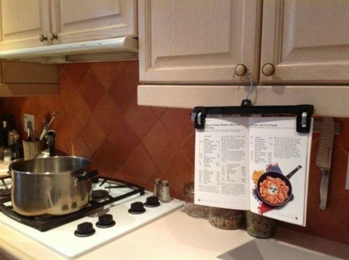 Из обыкновенной вешалки получается удобное крепление для книги рецептов.