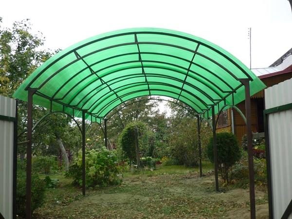 Поликарбонат достаточно гибок, поэтому из него можно сооружать навесы разных видов: круглые, треугольные, арочные и других форм, которые придут в голову. А разные оттенки материала позволяют воплотить любые дизайнерские фантазии: вы легко сможете сделать навес, подходящий к цвету автомобиля или к общей цветовой гамме построек.