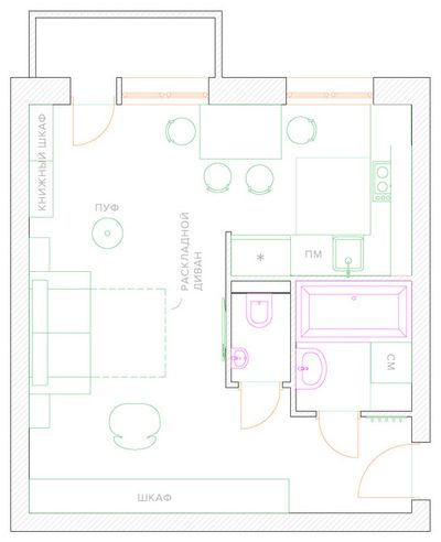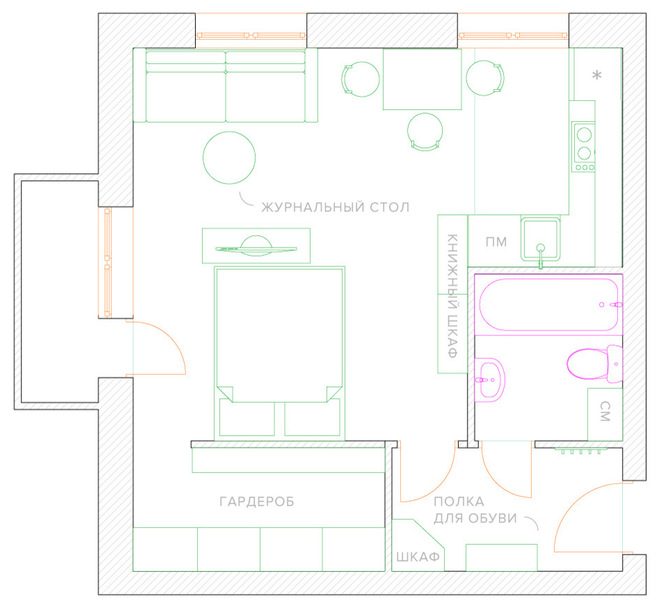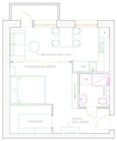 Минусы планировки: недостаток зон хранения, отсутствие стола.