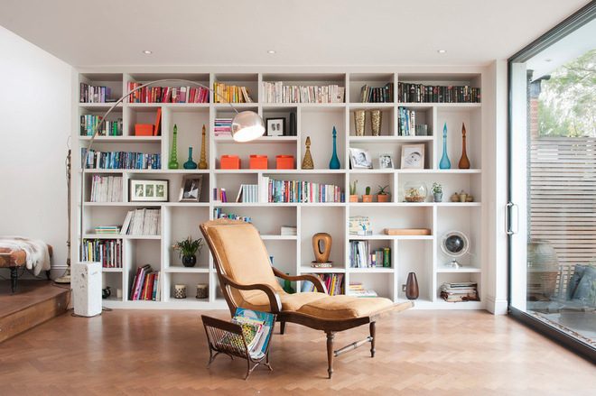 Даже самый маленький стеллаж можно превратить в объект творчества, если спроектировать его специально под себя и покрасить в любимый цвет. Хороший пример такого дизайна — на этом фото.