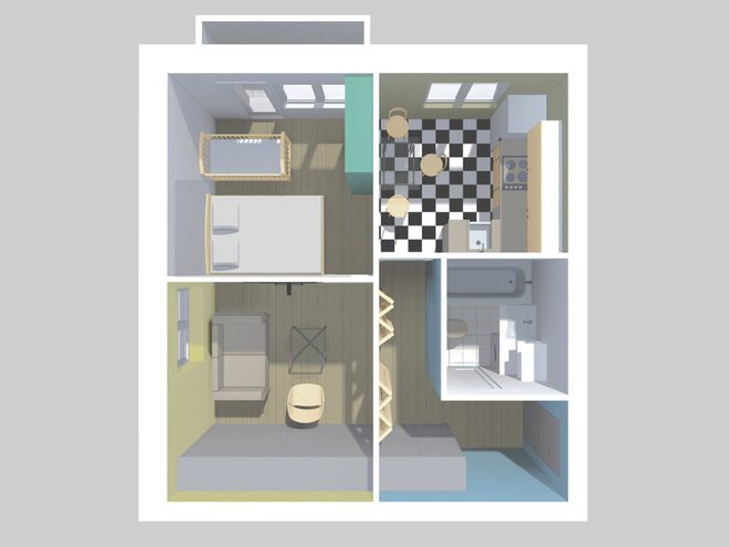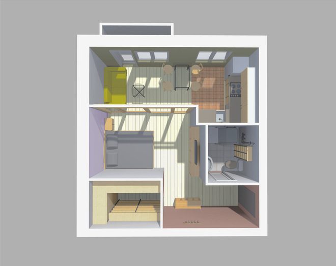 Здесь из одной большой комнаты сделана маленькая спальня и гостиная, объединенная с кухней. Одна из стенок спальни расположена диагонально под углом, параллельно ей стоит барная стойка, которая продолжает кухонную поверхность. Такое расположение помогает экономить пространство, а так же делает его более интересным. В санузле вместо ванной стоит душевая кабина, кроме того, там расположены унитаз и общая столешница с умывальником, стиральной машиной и полками для хранения.