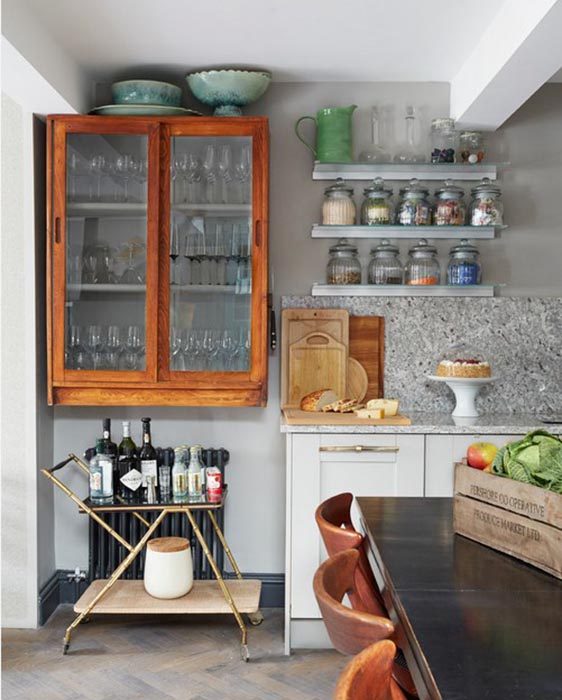 Не бойтесь сочетать старинные элементы с современными. Такое сочетание работает великолепно, если речь идет о стильности и индивидуальности. В этой кухне можно видеть старинный подвесной шкафчик в сочетании с современной мебелью и поверхностями. Красота в разнообразии.