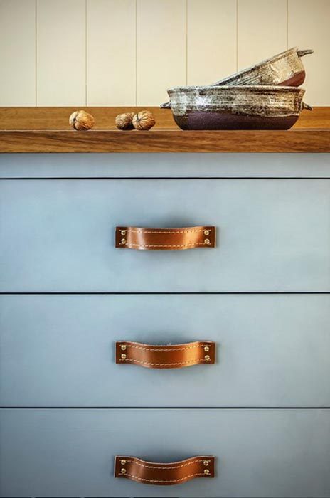 Ручки для мебели в основном бывают металлическими, деревянными или керамическими, а если использовать необычные для этой цели материалы, то кухня приобретет индивидуальность и собственный стиль. Вот, к примеру, на этой кухне ручки для мебели выполнены из полосок кожи. Они необычны и привлекают внимание.