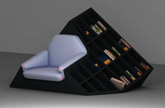 Нотки креативности в интерьер привнесёт мебель нестандартных форм. Например, кресло-стеллаж Tatik. Мобильный вариант библиотеки понравится любителям креативных решений. За книгами далеко ходить не нужно, смотрится такое кресло-библиотека необычно, да и книг здесь разместится немало.