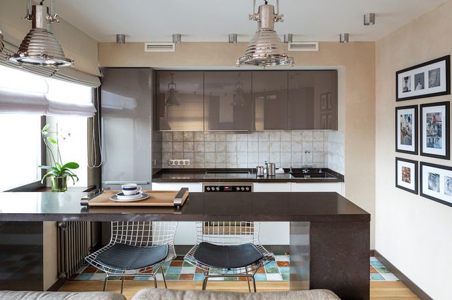 Кухня была довольно длинной и узкой, и создать там удобное и функциональное пространство было задачей не из легких. Поэтому дизайнеры решили объединить гостиную часть с кухней, разделив их барной стойкой. Стены, как и хотел владелец, сделали «лофтовыми», из кирпича. Правда, использовать раскрытый кирпич старых стен не получилось: он был в плохом состоянии, и поверх выложили новую кладку из клинкерной плитки.