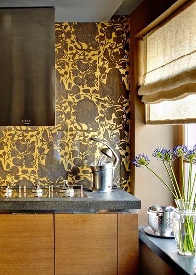 «После перепланировки кухня и гостиная стали фактически единым пространством, поэтому в зоне кухни хотелось использовать обои, а не плитку, как обычно. Выбрали ироничный вариант золотых обоев с «бешеным огурцом» от Cole & Son», — рассказывает Алла Шумейко. Прозрачное стекло защищает золотистые обои от перепадов влажности и брызг.