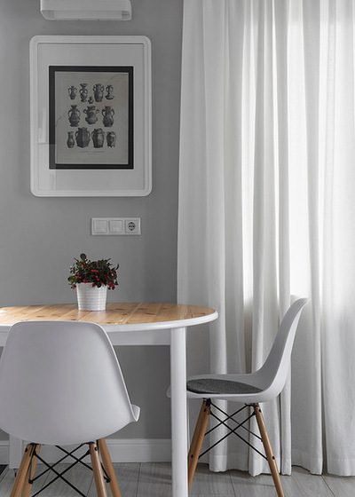 Дополнительное место для хранения нашлось и во встроенном диване под окном (батарея при этом осталась на своем месте). «Для конвекции воздуха сверху в подоконнике встроена решетка, а снизу оставлены отверстия в цоколе, — поясняет автор проекта. — Несмотря на внешнюю компактность столовой, мягкий диванчик, раскладной стол и легкие стулья позволяют рассадить не менее 6 человек».
