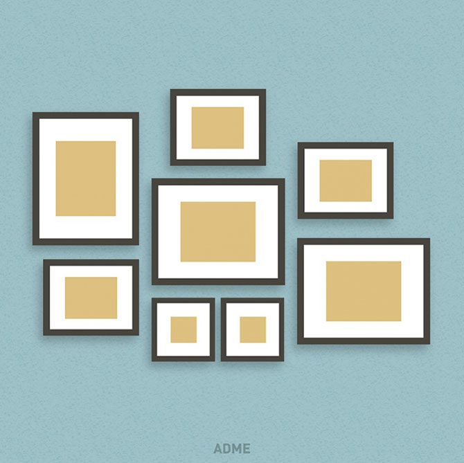 Довольно простой способ размещения фотографий, но, несмотря на это, за счет четких линий смотрится очень выигрышно. Расположите квадратные рамки одного размера на одинаковом расстоянии друг от друга так, чтобы в итоге получился квадрат. В рамки можно вставить фотографии на единую тематику или просто собрать любимые снимки в одной цветовой гамме — главное, чтобы они гармонично смотрелись вместе.