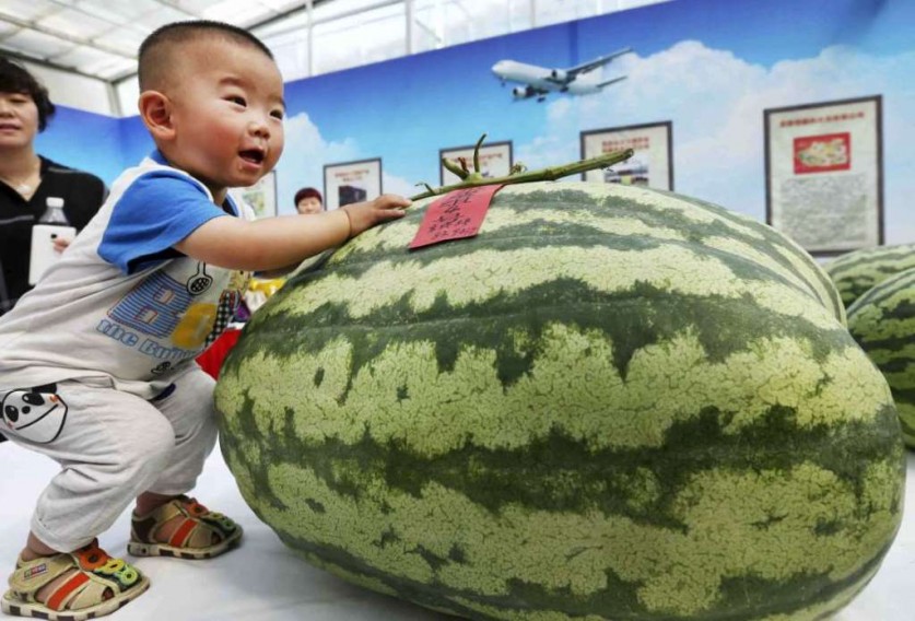Арбуз. Мальчик позирует с 84-килограммовым арбузом во время фестиваля арбузов в Пекине.