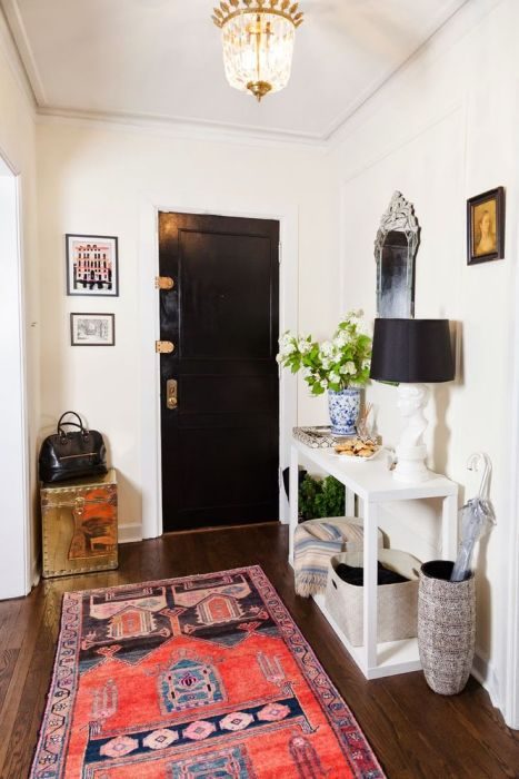 Оформляя маленькую прихожую редко задумываются о том, что дверь также может стать достойным украшением интерьера. Стоит лишь покрасить её в интересный оттенок. Чтобы пространство смотрелось гармонично, не лишним будет подобрать коврик и другие предметы декора, в которых повторяется цвет двери.