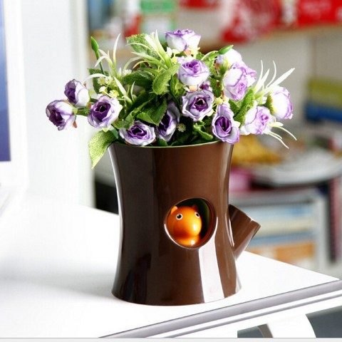 Самоувлажняющее кашпо для длительных отлучек из дома. Воду наливаем в нижний резервуар, оттуда она по мере надобности поступает к цветку. Белка в дупле показывает уровень жидкости.