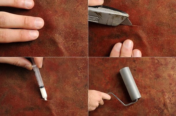 Аккуратно проткните вздутие по центру, выдавите из него воздух и заполните его с помощью шприца клеем. Затем разгладите пузырь выдавив из него излишки клея, для этого, возможно, вам понадобиться его проколоть в месте скопления клея или даже немного разрезать с помощью острого лезвия.
