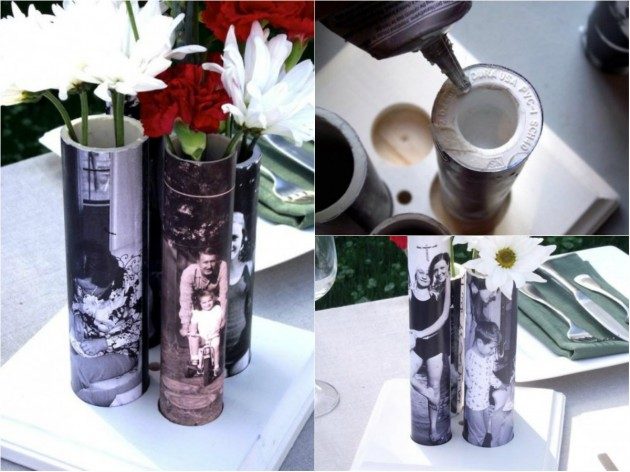 Такую вазу можно сделать на любой праздник. Трубы ПВХ, закреплённые в основании, фотографии приятных моментов или любимых людей и, конечно, цветы.