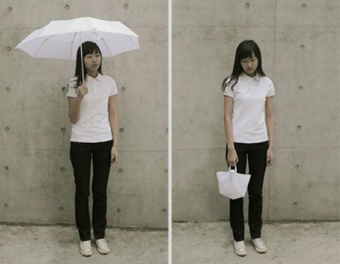 Зонт, который складывается в маленькую сумочку таким образом, чтобы мокрая сторона была внутри.