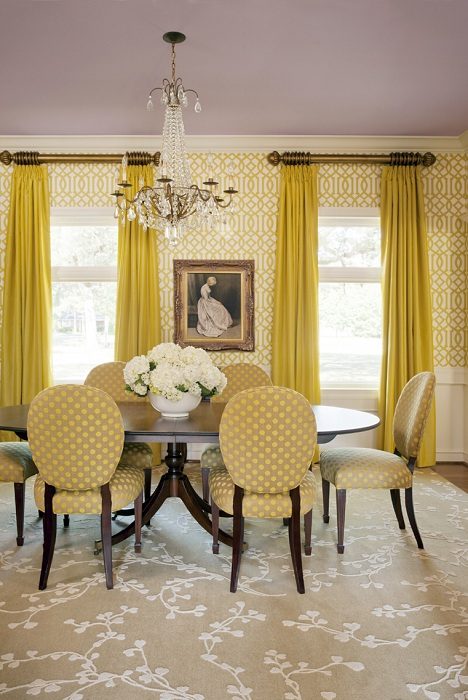 Столовая с обоями и шторами в полоску, которые делают её ярче.