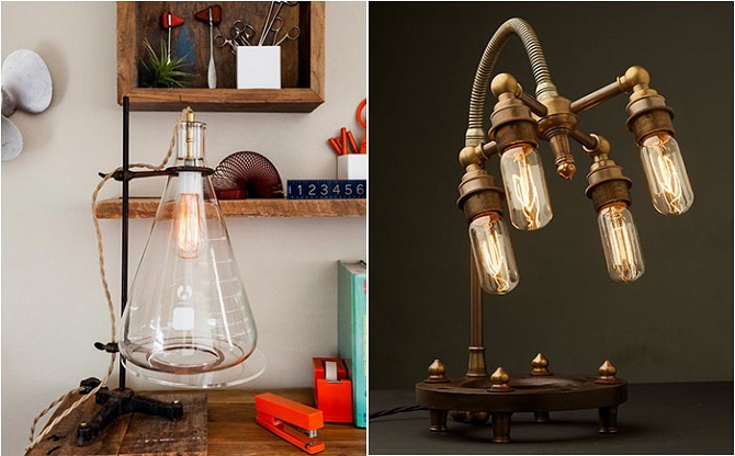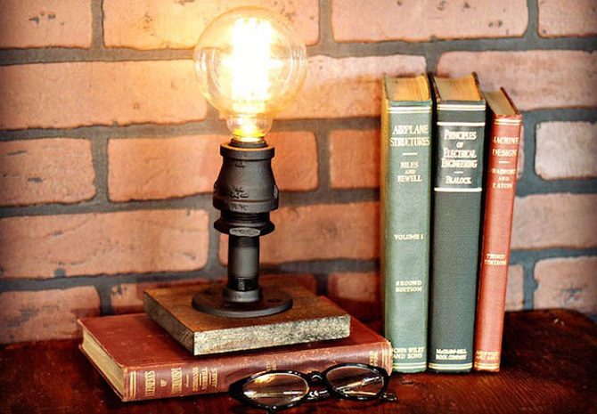 Индустриальный стиль на самом деле не так прост, как кажется на первый взгляд. Он требует неповторимых деталей, оригинальных аксессуаров, неповторимого декора. Настольная лампа – одна из удивительных возможностей проявить неординарный подход при оформлении интерьера. Трубы, лампочки, запчасти – пригодится всё.