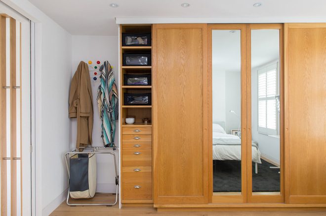 Идеальный вариант для хранения одежды, которую вы уже надевали — отдельный шкаф для нее. Он может быть совсем небольшим — в одну-две секции, — так что не займет много места. Шкаф может стоять или в спальне, или в прихожей — в зависимости от того, где вы привыкли переодеваться. Там же логично хранить и домашнюю одежду.